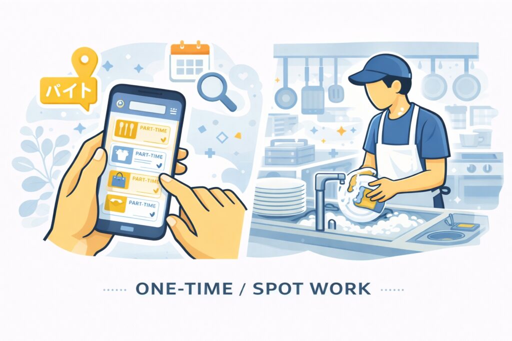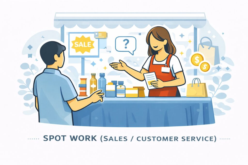 接客・販売のスポットワークとは、短期や単発でお店や売り場の接客を手伝う副業バイトです。たとえば、レジ補助、商品案内、品出し、試食販売、催事販売、イベント会場での接客などがあります。土日や繁忙期だけ募集されることも多く、本業の合間に働きやすいのが特徴です。人と話すことが苦にならない方や、明るく丁寧に対応できる方に向いています。短時間や単発で入りやすく、接客経験を活かしたい方にも相性のよい副業です。